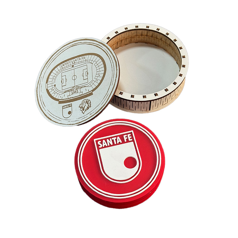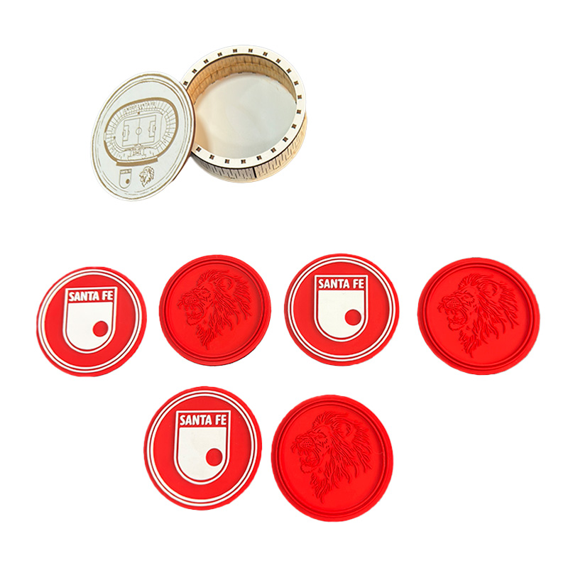 KIT  DE 6 PORTAVASOS en caucho micro-inyectados y estuche en caja de madera elaborado en corte láser.
