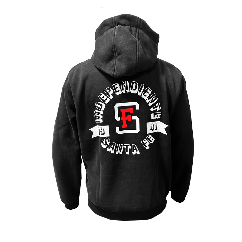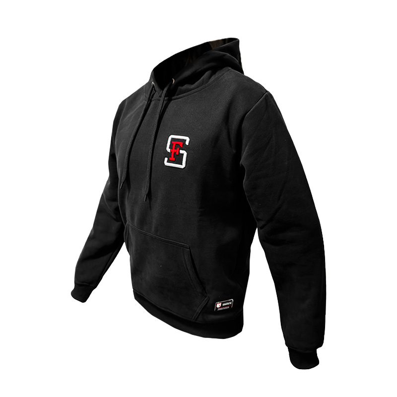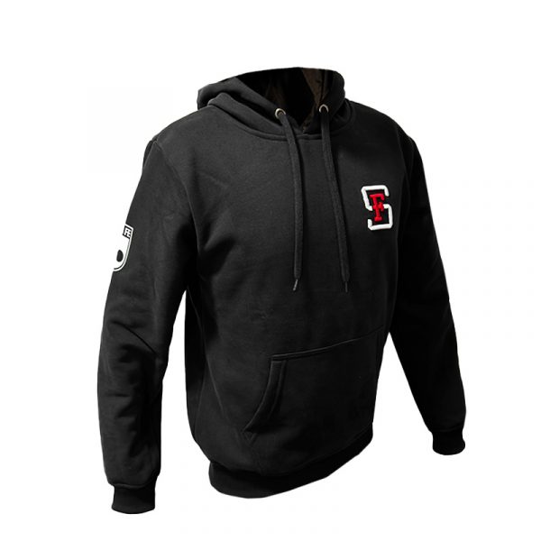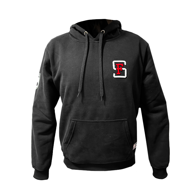 Buzo tipo hoddie color negro SF bordado espalda estampada , capucha con cordones, manga larga derecha estampada y puños ajustados.